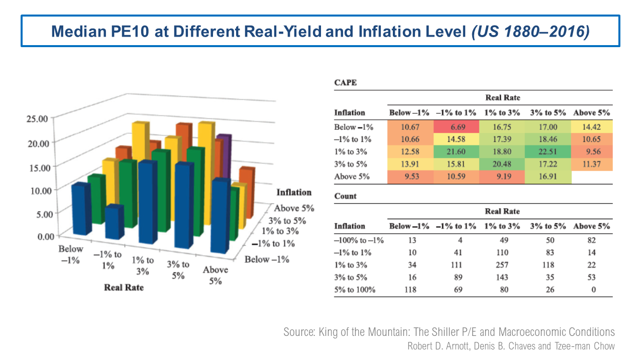 According to this very interesting research paper called King of the Mountain, the PE10 metric varies across different macro-economic conditions, specifically the level of real interest rates and inflation. The authors further claim that PE10 becomes a statistically significant and economically meaningful predictor of shorter-term returns under the assumption that PE10 levels mean-revert toward the levels suggested by prevailing macroeconomic conditions rather than toward long-term averages. The graph below shows the results from the research for different real yield and inflation levels, the so-called valuation mountain.