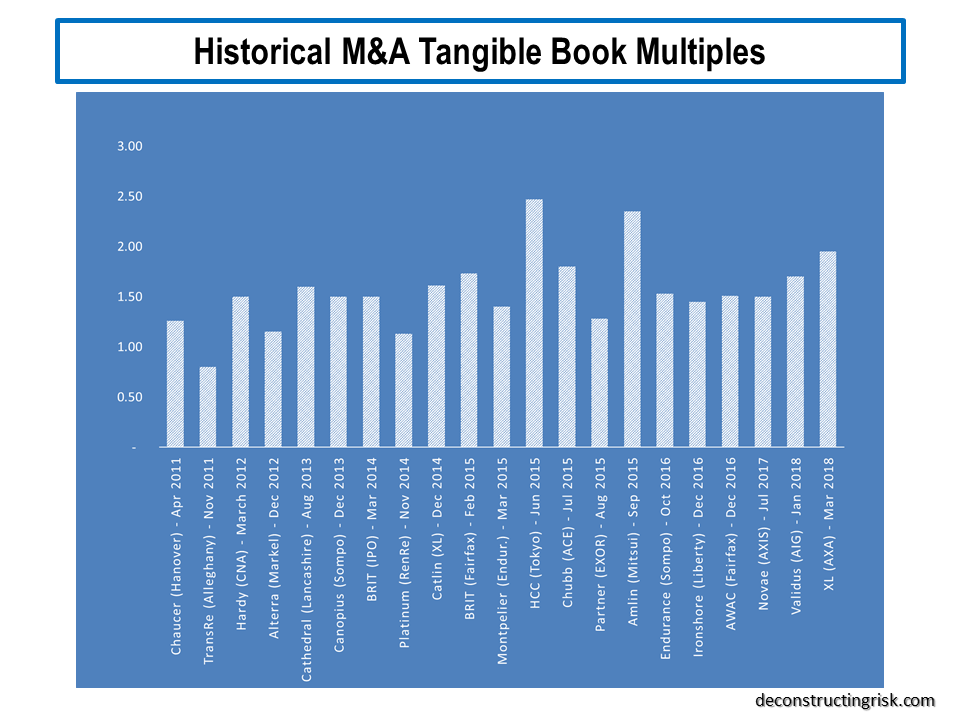Unless there are major synergies, either on the operating side or on the capital side (which seems to be AXA’s justification for the near 2X multiple on the XL deal), I just can’t see how a 2X multiple is justified in a mature sector. Assuming these firms can earn a 10% return on tangible assets over multiple cycles, a 2X multiple equates to 20X earnings!