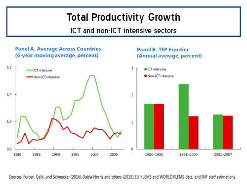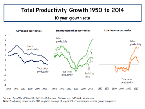 The IMF has sponsored another paper from staffers on the global productivity slowdown, with the catchy title “Gone with the Headwinds”. The paper reiterates many of the arguments concerning advanced economies referenced in this post, such as total factor productivity (TFP) hysteresis due to the boom-bust financial cycle and resulting capital misallocation, “an adverse feedback loop of weak aggregate demand, investment, and capital-embodied technological change”, elevated economic and policy uncertainty.