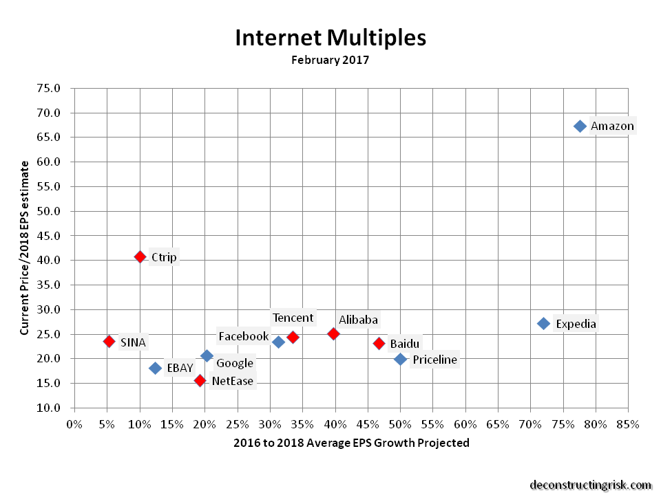 Based upon this graph, Google and Netease again look worthy of investigation with similar profiles to two years ago. Netease has the attraction of a strong growth track record with the obvious Chinese political risk to get over. Expedia looks intriguing given the strong growth projected off a depressed 2016 EPS figure. Ebay and Priceline may also be worth a look purely on valuation although I have a general aversion to retail type stocks so I doubt I’ll bother look too deeply. All of the data used for these graphs is based upon analyst estimates which also need to be validated.