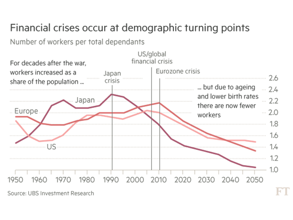 There was an interesting article recently in the FT called “The effects of aging” which included the graph below from UBS which strikingly highlights the changes in demographic trends and financial crises.