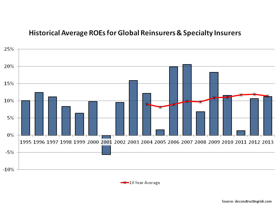 My analysis shows that currently investors should only make a loss on this “average” portfolio once every 4 years (i.e. 25% of the time). Back 5 years ago, I estimate that probability at approximately 17% or roughly once every 6 years. If pricing deteriorates further, to the point where net premium is equal to the aggregate expected loss on the portfolio, that probability increases to 36% or roughly once every 3 years