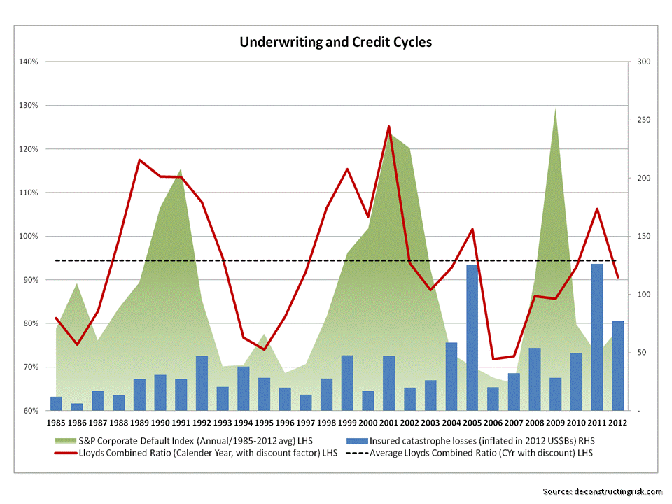 The first thing to note is that credit and insurance cycles can be driven from the same event – 9/11 and COVID are obvious applicable cases. The graphic shows that the credit cycles over the past 20 years do not obviously influence the underwriting cycles with insured CAT losses being a much more relevant factor in the underwriting cycle.